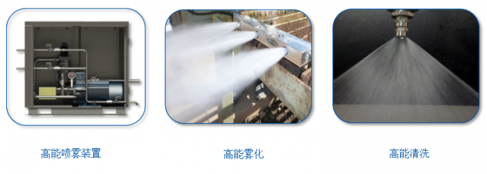 高能噴霧裝置主要是由高壓柱塞泵加壓系統(tǒng)、調(diào)壓系統(tǒng)、多路控制系統(tǒng)、主機(jī)排污系統(tǒng)、水源凈化系統(tǒng)(選配)以及電控系統(tǒng)等組成。