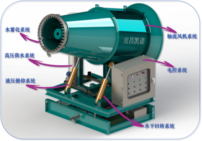 霧炮抑塵裝置主要是由高壓供水系統(tǒng)、水霧化系統(tǒng)、軸流送風系統(tǒng)、水平回轉(zhuǎn)系統(tǒng)、上下俯仰系統(tǒng)以及電控系統(tǒng)等組成。