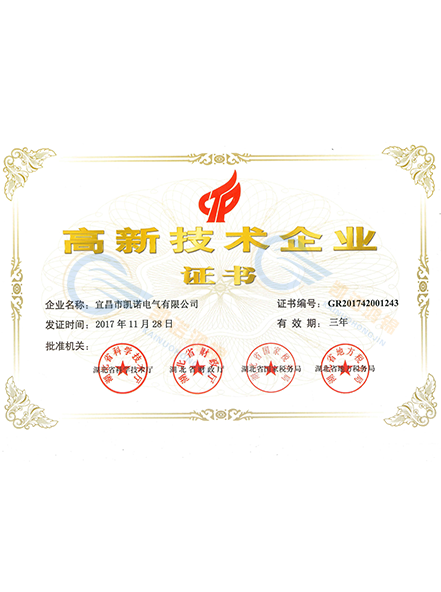 2012年宜昌市凱諾電氣有限公司取得國家級高新技術(shù)企業(yè)證書。