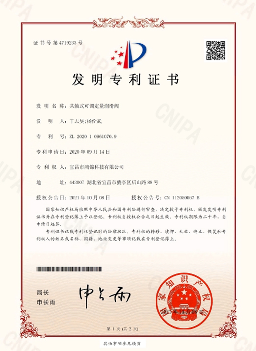 2021.10.8宜昌市鴻錦科技公司有限公司立項申請的共軸式可調(diào)定量潤滑閥發(fā)明專利已授權(quán)。
